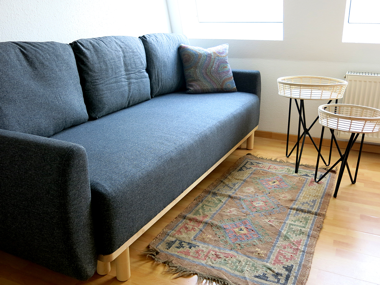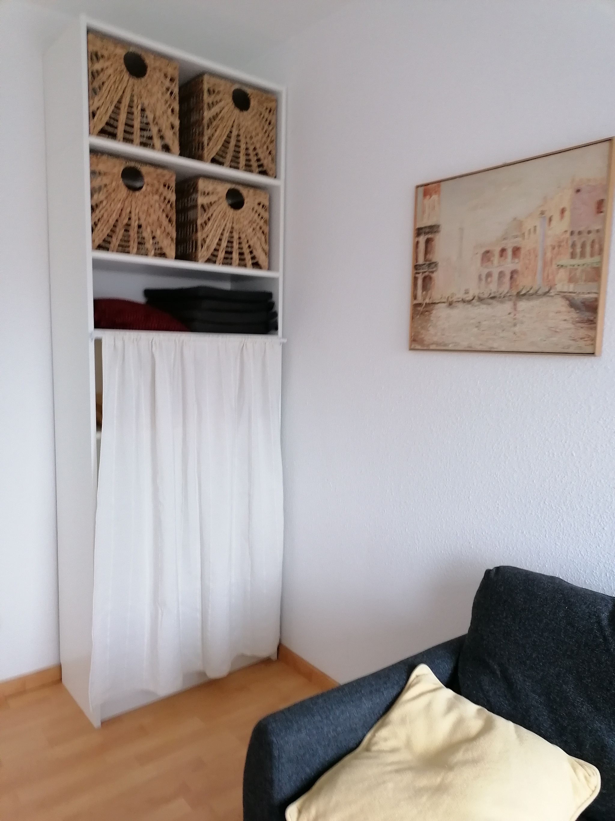 Zimmer mit einer Doppelbettcouch, Regal, Schreibtisch und Stuhl. Ideal geeignet als Arbeitszimmer, für Home-Office und ruhiges Arbeiten.