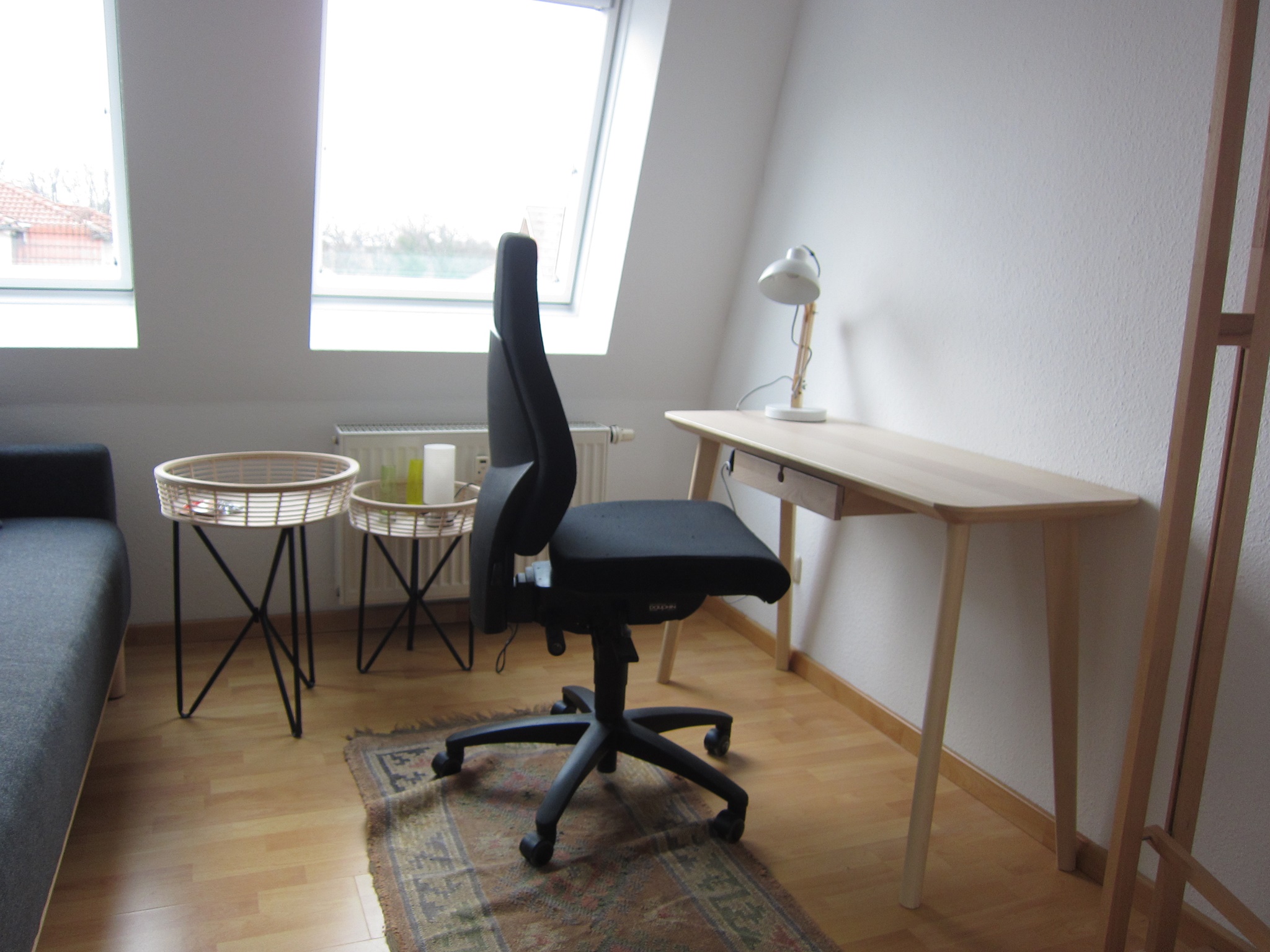 Zimmer mit einer Doppelbettcouch, Regal, Schreibtisch und Stuhl. Ideal geeignet als Arbeitszimmer, für Home-Office und ruhiges Arbeiten.